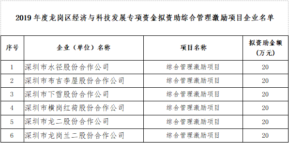 現將2019年度龍崗區經濟與科技發展專項資金擬資助綜合管理激勵項目社區股份合作公司名單在龍崗區政府在線公示,向社會各界廣泛征求意見。
